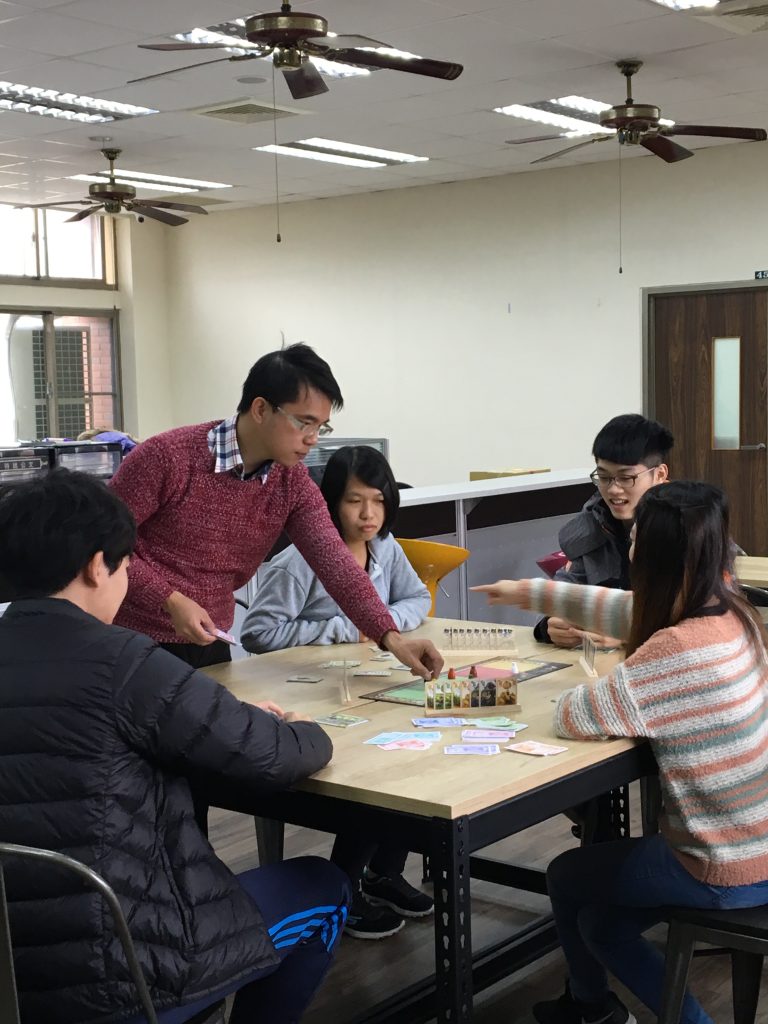 老師在系辦透過財金益智桌遊,指導同學相關財金概念。