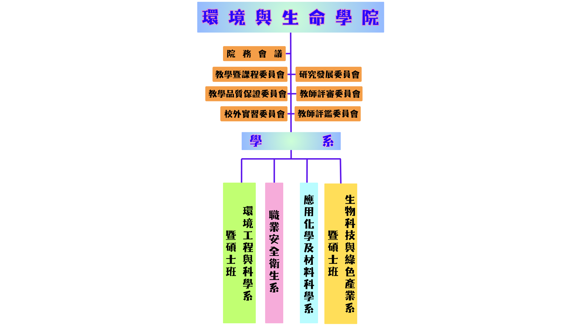 本院設環境工程與科學系、職業安全衛生系、應用化學及材料科學系及生物科技與綠色產業系等四個學系,其中環境工程與科學系及生物科技與綠色產業系設有研究所碩士班,以利於學生之進程發展。